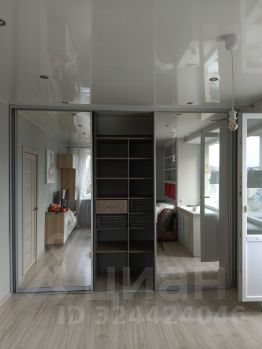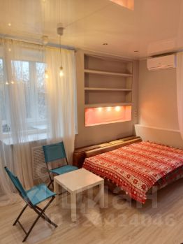 Мебель: диван раскладной с новым матрацем, сделанным на заказ, зеркальный большой встроенный гардероб, небольшая обеденная зона со стульями.