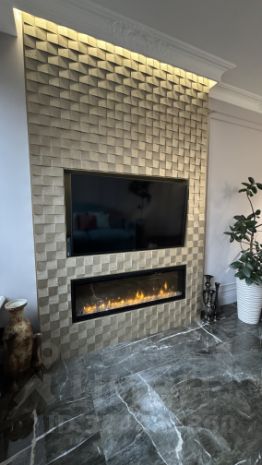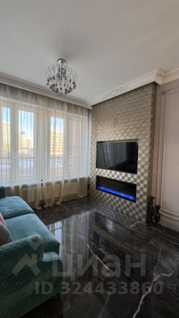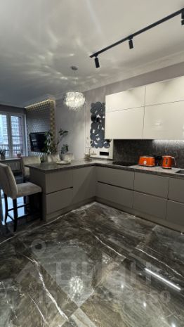 Кухня-гостиная: Стала сердцем квартиры — здесь есть все для отдыха и приема гостей: уютный мягкий диван, большой телевизор и стильный камин, создающий невероятную атмосферу.