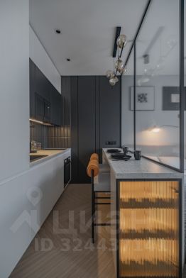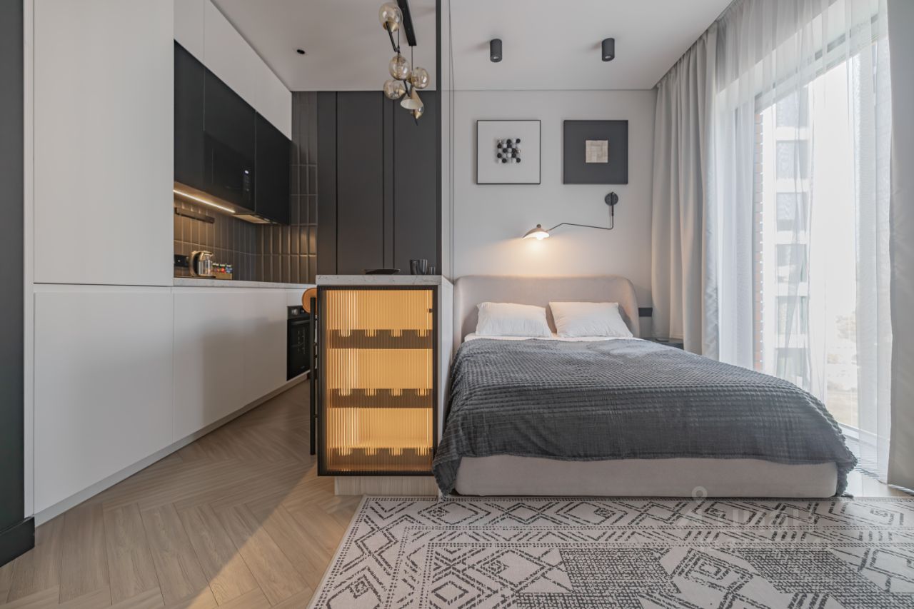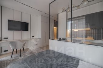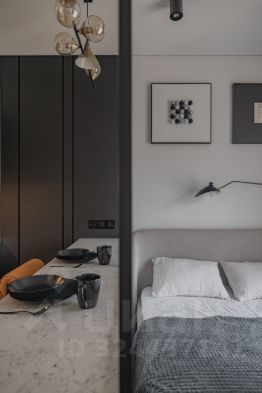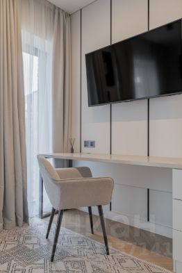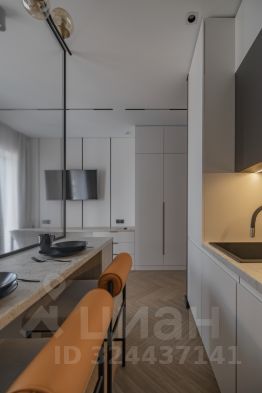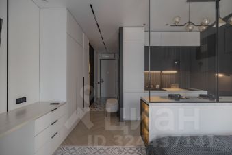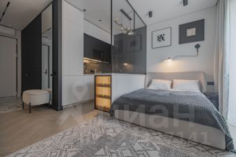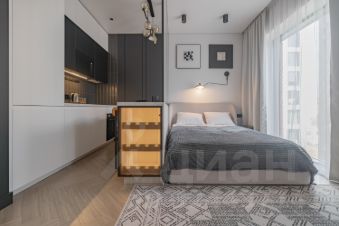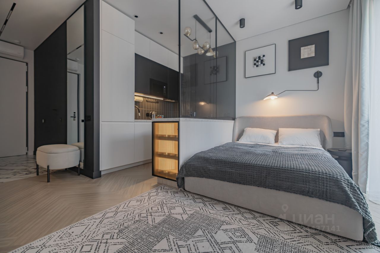 Просторная, светлая квартира - студия с остеклением в пол и свежим дизайнерским ремонтом с интересными и стильными акцентами в спокойных тонах.