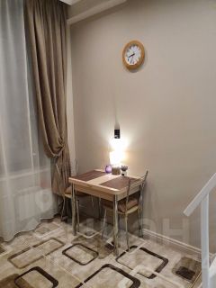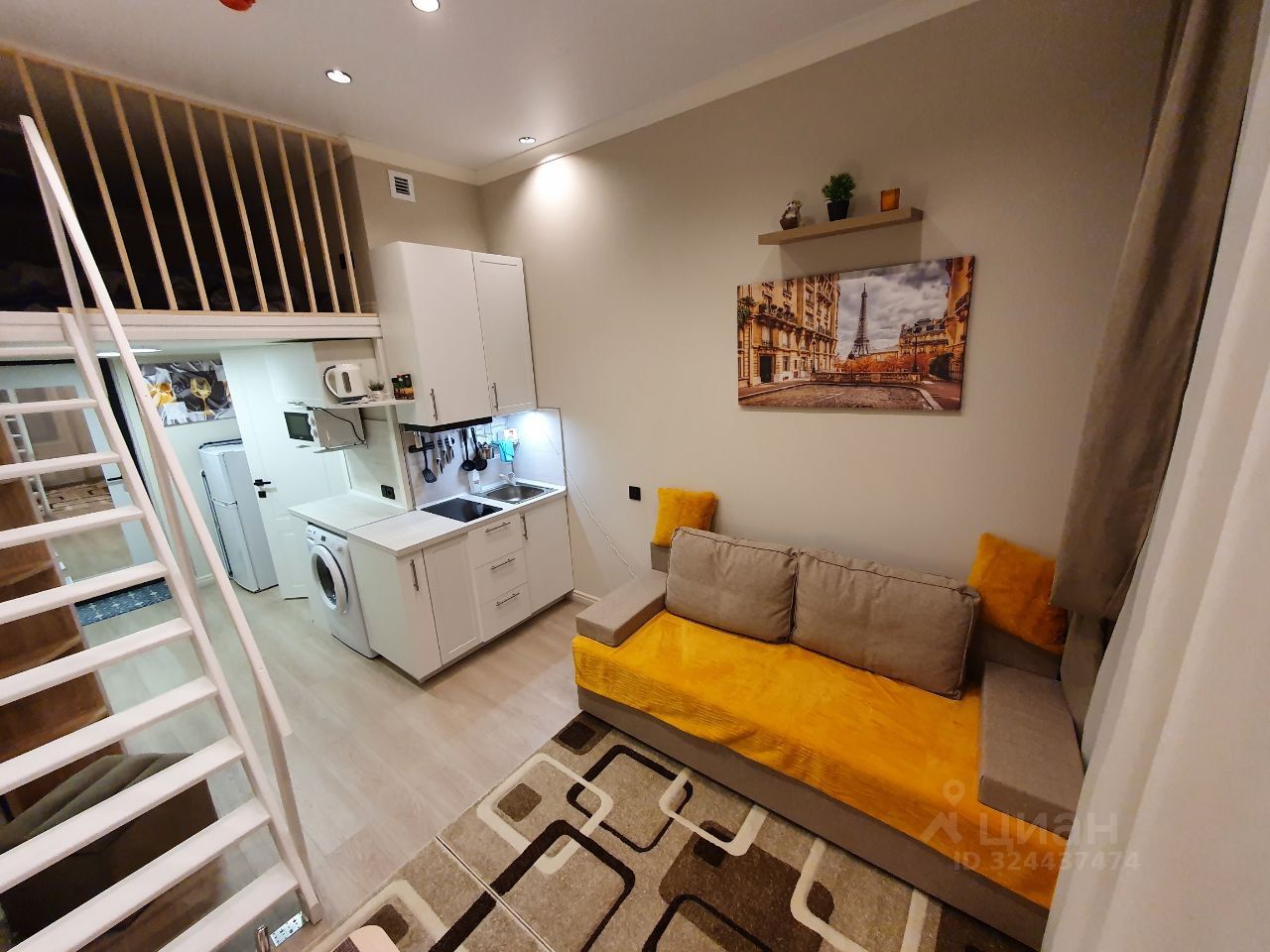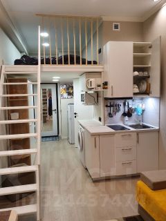 Студия выполнена в современном стиле, с высокими потолками и большими панорамными окнами.
