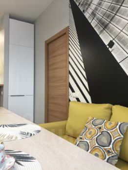 Квартира с дизайнерским ремонтом, полностью меблирована и готова к заселению. В комнате имеется современная мебель, а на кухне — всё необходимое. Из техники есть холодильник, посудомоечная и стирально-сушильная машины, телевизор. Туалетная комната оборудована душевой кабиной. Окна выходят на улицу и во двор, что позволяет наслаждаться прекрасными видами.