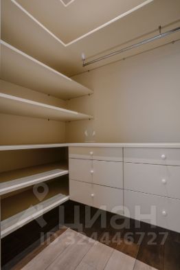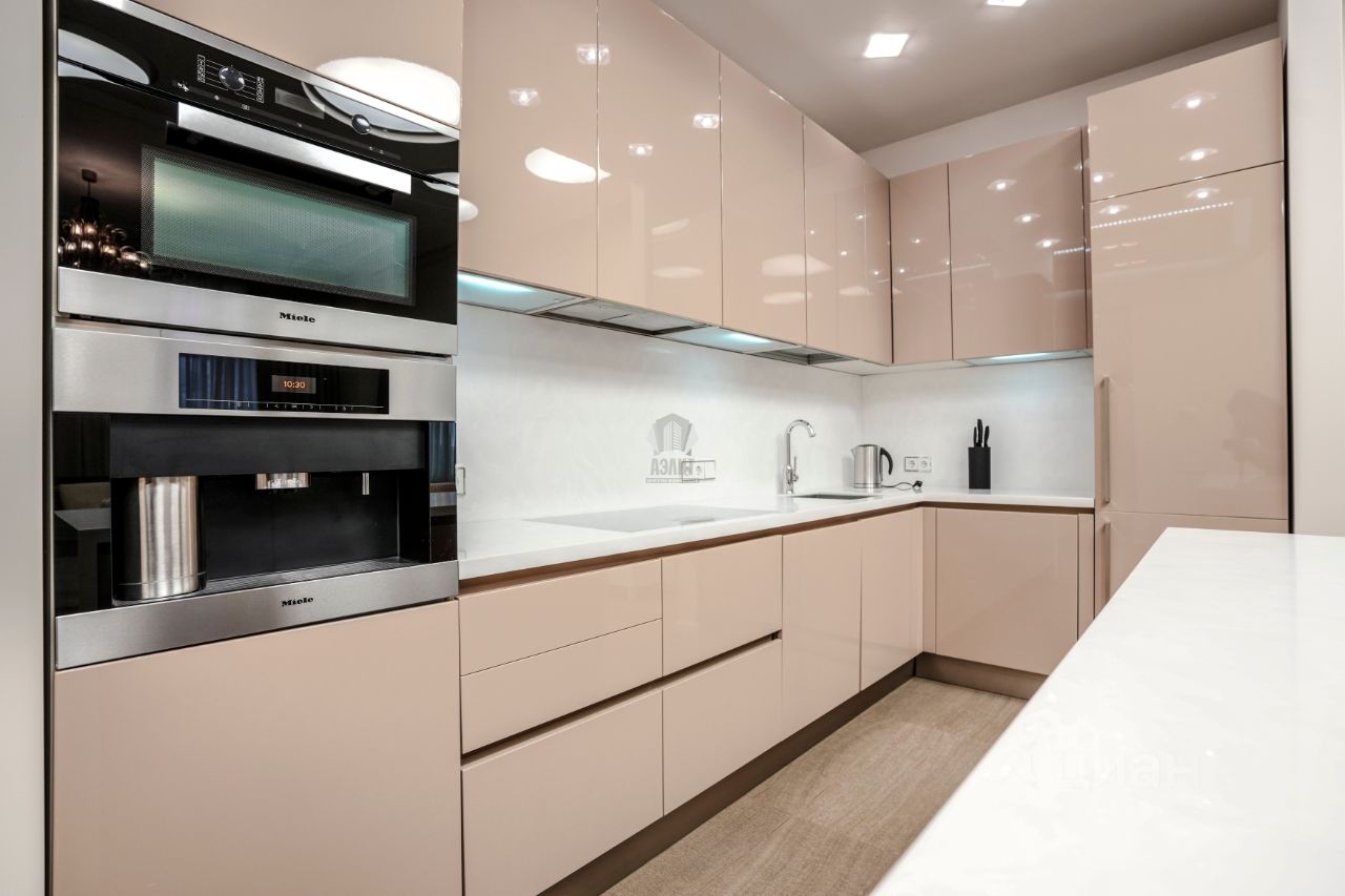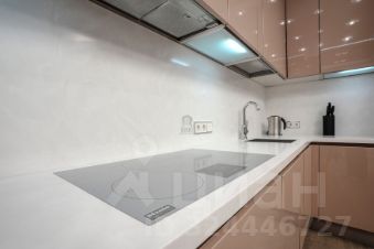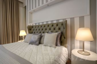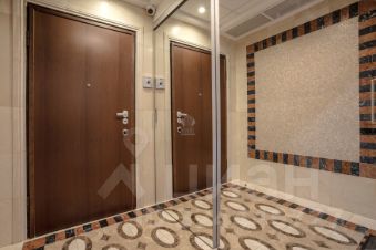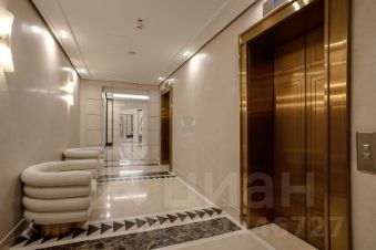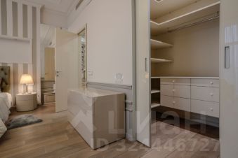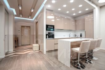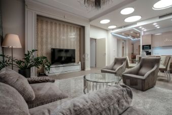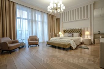 Интерьер оформлен в современном стиле с использованием натуральных материалов. Планировка включает гостиную-студию с панорамными окнами, три спальни и три санузла. Квартира полностью меблирована импортной мебелью и предметами, изготовленными на заказ.