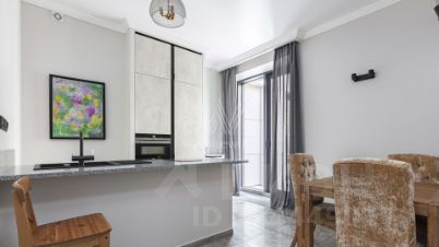 Планировка: просторная кухня-столовая, большая спальня, вторая спальня с рабочей зоной, ванная комната с ванной и душевой, гостевой санузел, гардеробная-постирочная, холл. Кухня оснащена встроенной техникой Siemens — посудомоечная машина, духовой шкаф. Установлена система кондиционирования, стиральная машина с функцией сушки, фильтр питьевой воды и нагреватель воды. Машиноместо в подземном паркинге не входит в стоимость.