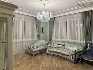 Квартира прошла дизайнерский ремонт, в интерьере использованы качественные материалы и современные решения. Планировка включает три комнаты, две из которых могут служить спальнями, и просторную гостиную. В квартире также есть два отдельных санузла с ванной и душевой кабиной. Кухня полностью оборудована необходимой мебелью и техникой, включая холодильник, посудомоечную машину и кондиционер. В комнатах также есть вся необходимая мебель.