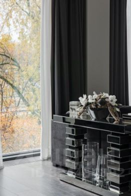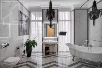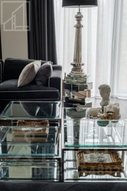 Планировка: просторная кухня-гостиная, спальня с вместительной гардеробной, своим санузлом с ванной и душевой, гостевой санузел. Гардеробная 20 м² с местами хранения для обуви, платьев, сумок. Интерьер украшен изящной белой лепниной и молдингами. В гостиной установлен действующий дровяной камин ручной работы из травертина. Квартира полностью меблирована и оснащена всей необходимой техникой.