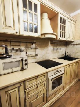 Стильная кухня оборудована встраиваемой импортной техникой, большое количество выдвижных ящиков и мест хранений, предоставлена мелкая бытовая техника для комфортного проживания, имеется выход на лоджию с дополнительной зоной хранения.