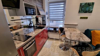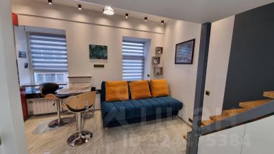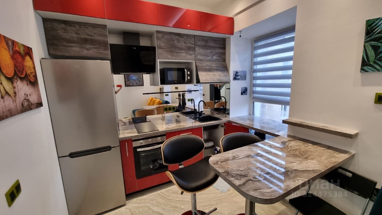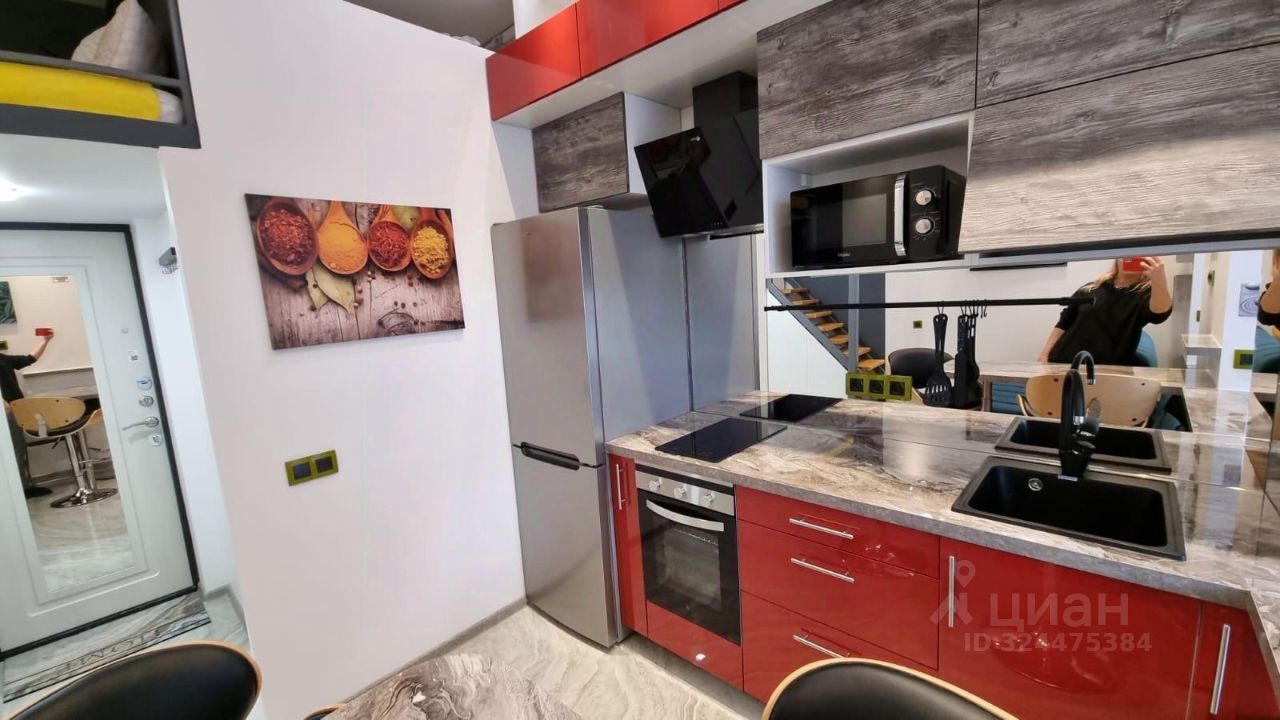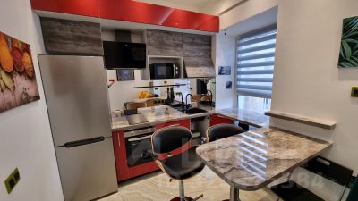 В студии недавно сделан дизайнерский ремонт. Пространство организовано максимально эффективно: есть вся необходимая мебель как на кухне, так и в комнате. Здесь же установлена современная техника: кондиционер, холодильник, телевизор и стиральная машина. Ванная комната оборудована душевой кабиной.