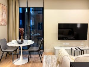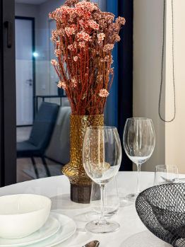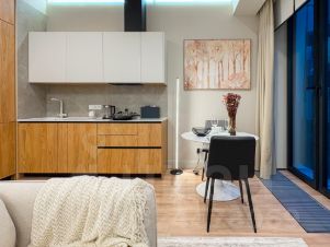 - кухонная зона: обеденный стол с двумя стульями, кухонный гарнитур со всей необходимой бытовой техникой и посудой.