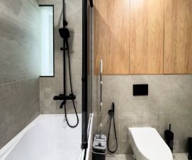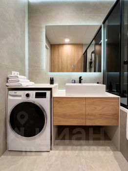 - Ванная комната с санузлом зеркало с подсветкой, раковиной, стиральной машиной.