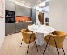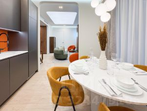 - кухонная зона: обеденный стол с четыримя стульями, кухонный гарнитур со всей необходимой бытовой техникой и посудой.