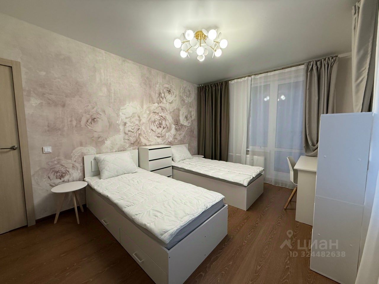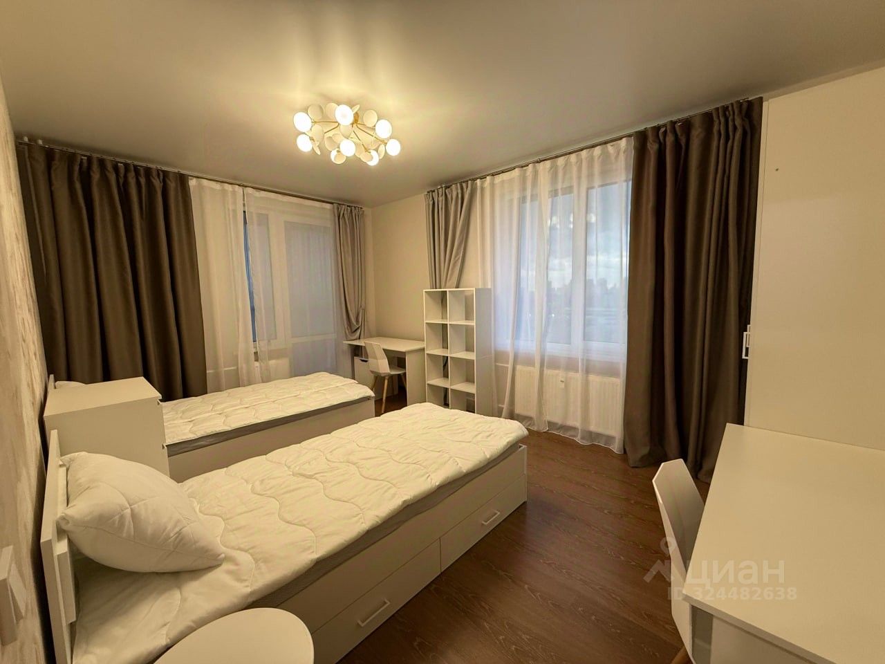 В комнате есть всё для двоих: комоды, шкафы, 2 стола, стеллаж, прикроватные столики.