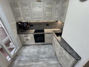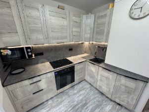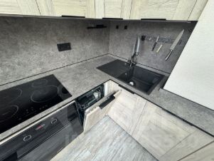Встроенная техника : посудомоечная машина, индукционная варочная панель, духовой шкаф, измельчитель, СВЧ, вытяжка, система очистки воды, холодильник.
