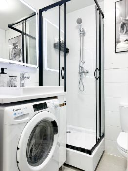 Бытовая техника: стиральная машина с функцией сушки, холодильник, духовой шкаф, варочная панель, микроволновая печь, кондиционер, утюг, пылесос, чайник, а так же все необходимое для комфортного проживания, включая посуду, подушки, одеяло, постельное белье.