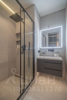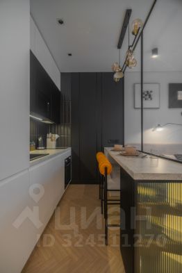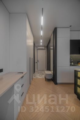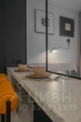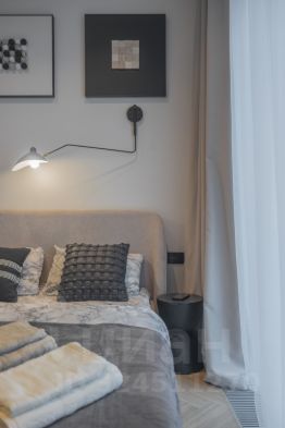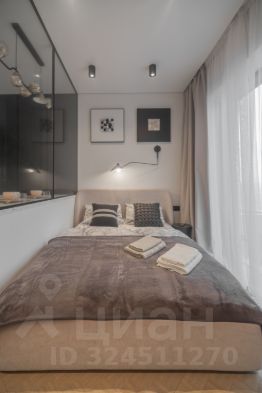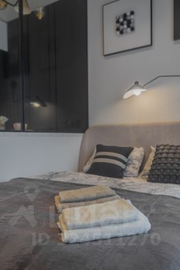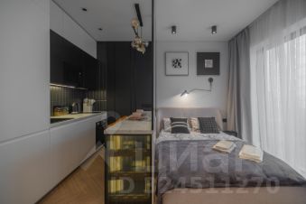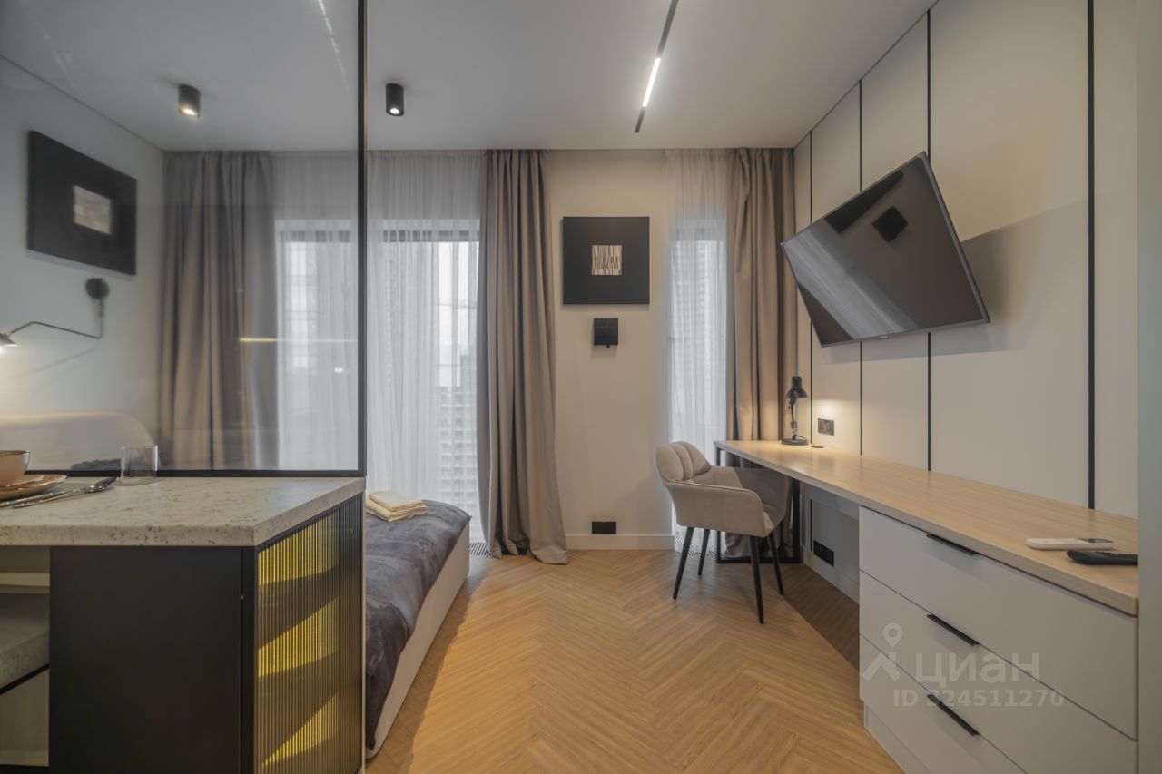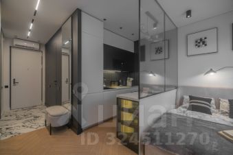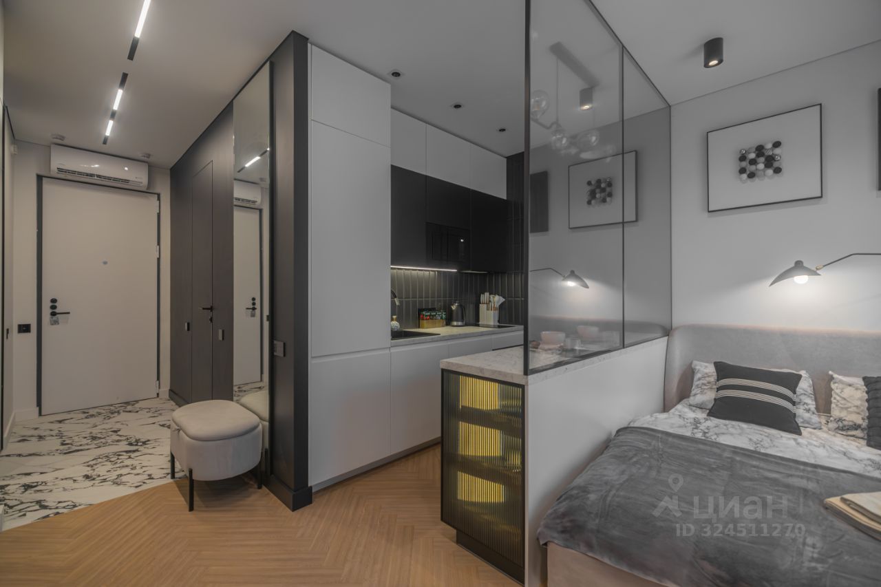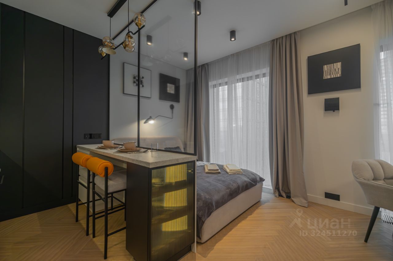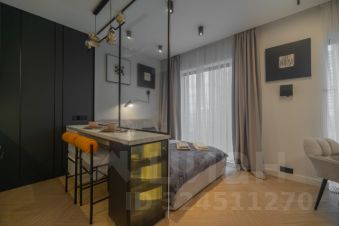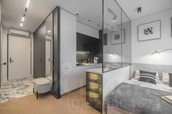 Просторная, светлая квартира - студия с остеклением в пол и свежим дизайнерским ремонтом с интересными и стильными акцентами в спокойных тонах.