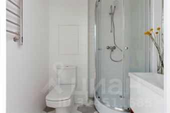 В студии совмещенный санузел с душевой кабиной, раковиной и зеркалом с подсветкой.
