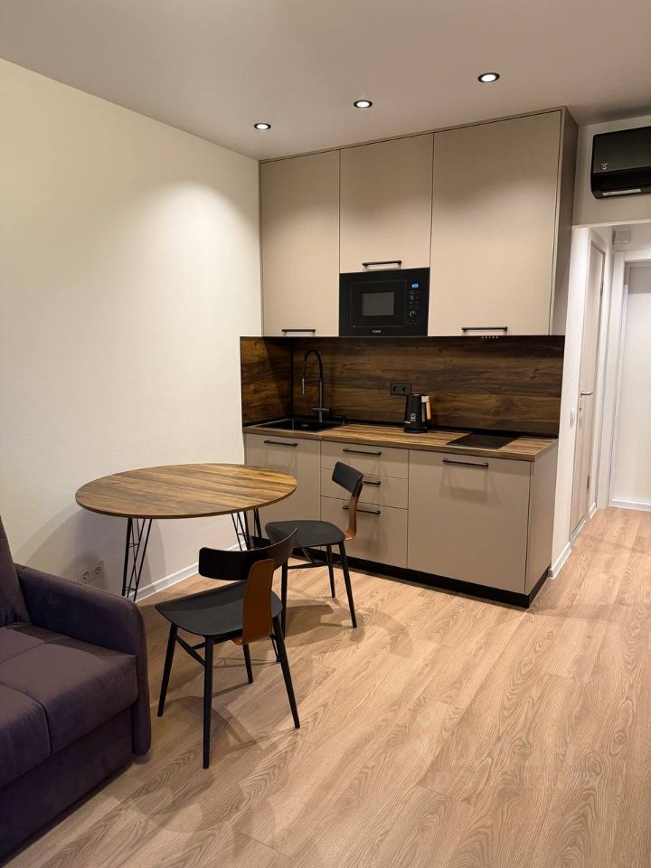 В квартире выполнен евроремонт, что создает атмосферу уюта и стиля. Просторная комната площадью 15 кв. м оборудована всей необходимой мебелью. На кухне также есть мебель и полный комплект современной техники: кондиционер, холодильник, посудомоечная и стиральная машины, телевизор. Совмещенный санузел с душевой кабиной добавляет удобства.