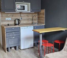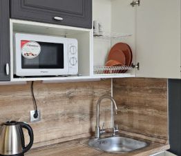Бытовая техника : холодильник, плита, микроволновая печь, электрический чайник, стиральная машина, телевизор.
