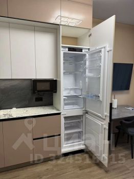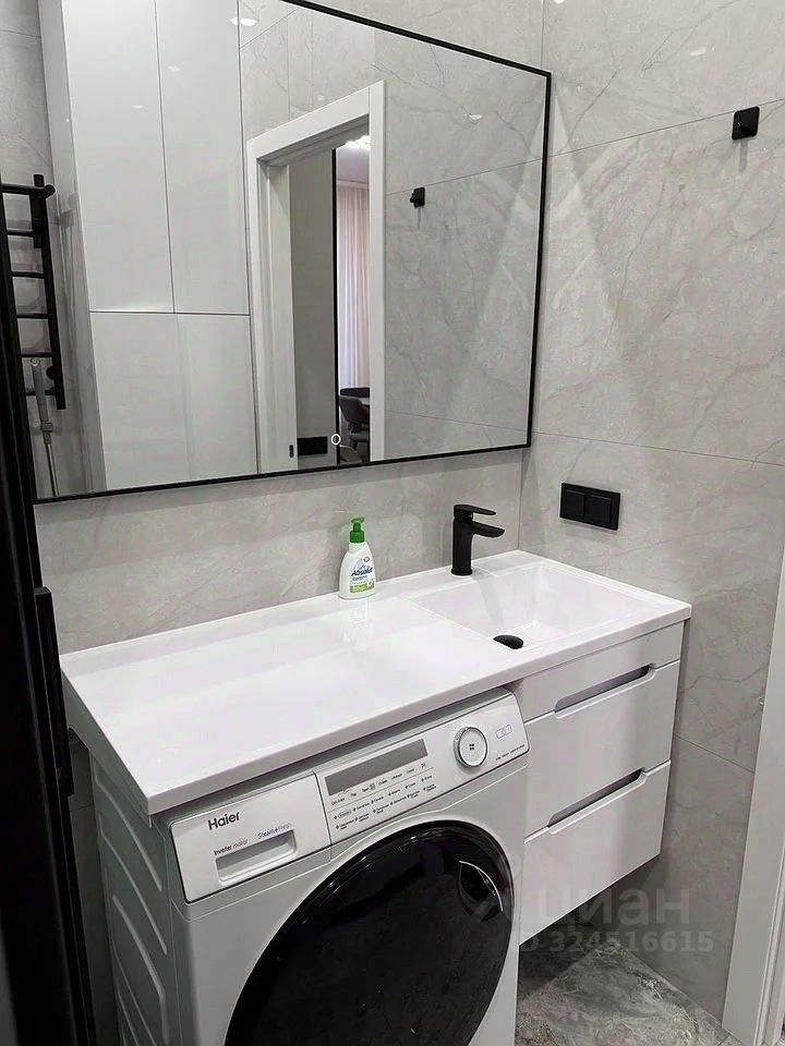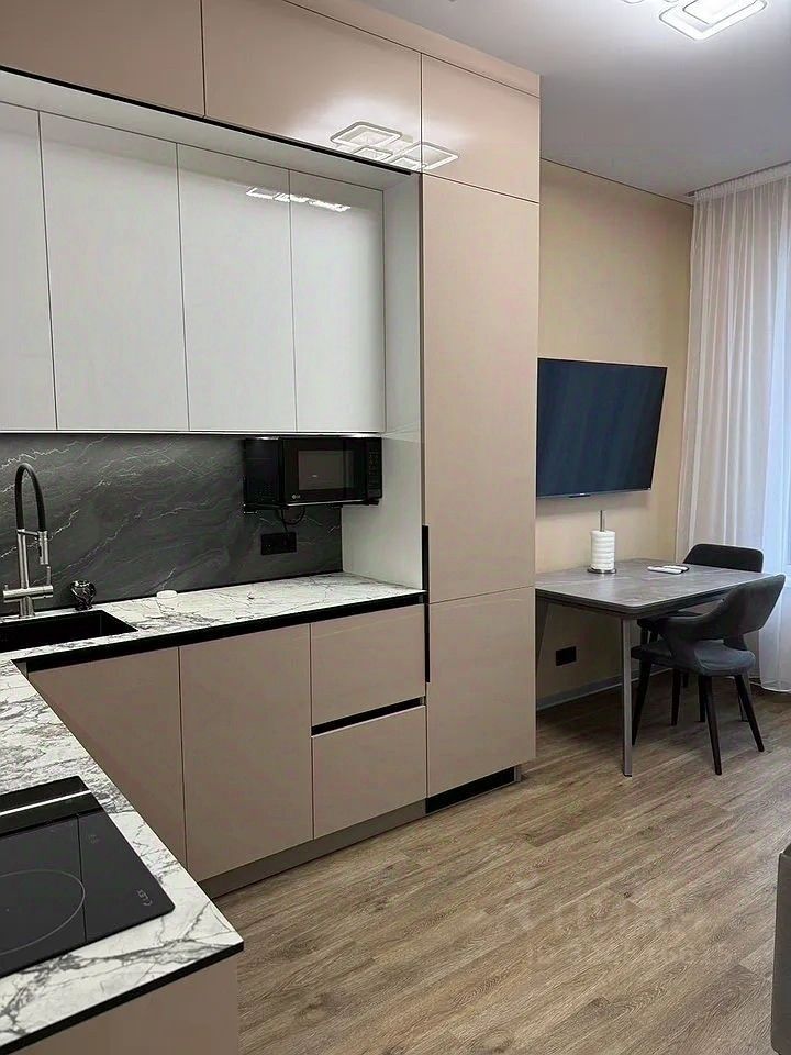 В квартире сделан современный евроремонт. На кухне и в комнате есть необходимая мебель и техника: кондиционер, холодильник, телевизор, посудомоечная и стиральная машины.