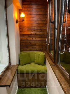 В спальне установлена двухспальная кровать с ортопедическим матрасом. Окна спальни, гостиной и кухни выходят во двор с видом на деревья. С кухни стеклянная дверь в пол ведет на застекленный балкон с местом для отдыха. Он утеплен и освещен - можно наслаждаться отдыхом даже зимой.