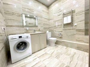 В квартире сделан современный евроремонт. Есть вся необходимая мебель на кухне и в комнате. Из техники: кондиционер, холодильник, телевизор, стиральная и посудомоечная машины. Планировка включает совмещённый и отдельный санузлы