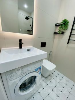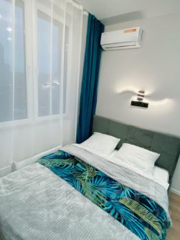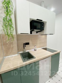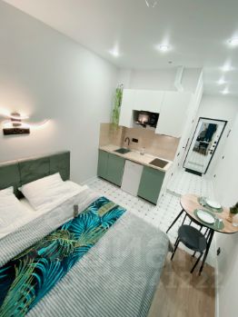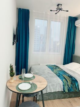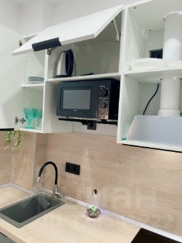 Студия полностью укомплектована всей необходимой мебелью и техникой для комфортного проживания, все новое. Чайник, индукционная варочная панель, микроволновая печь, стиральная машинка, смарт телевизор, холодильник, встроенная вытяжка, посуда, кондиционер, гигиенический душ. Окна на улицу фото реальный вид из окна.