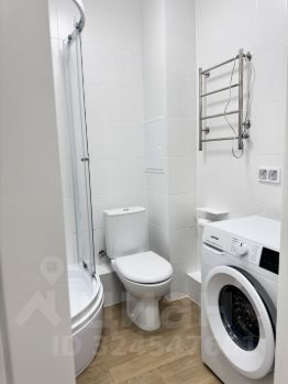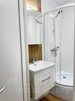 - в санузле установлена полноразмерная стиральная машина, душевая кабина, раковина с тумбой, шкафчик с зеркалом;