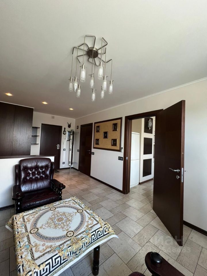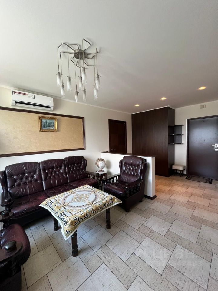 Гостиная объединена с прихожей, где стоит мягкая кожаная мебель, столик , вместительный шкаф, кондиционер.