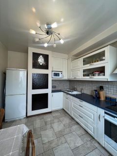 На кухне : встроенная кухня со всей бытовой техникой: плита -стеклокерамика, духовой шкаф, микроволновка , 2-х камерный холодильник , телевизор , обеденный стол со стульями.