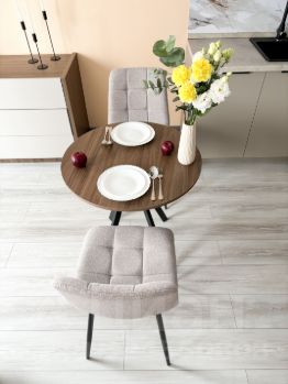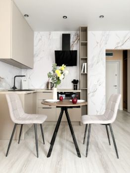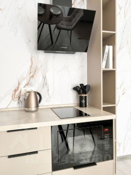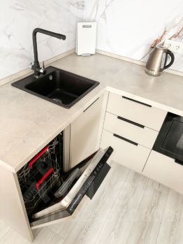 Бытoвая теxникa: телевизоp, стиральная машина, холодильник, вытяжка, варочная панель, электрический чайник, посудомоечная машина.