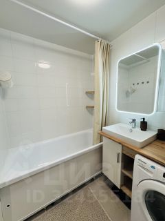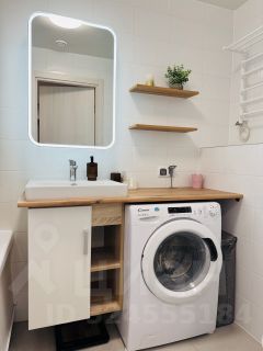 В квартире встроенная кухня с большим количеством шкафов для хранения, индукционная варочная панель, посудомоечная машина, вытяжка, холодильник с функцией No Frost, кондиционер, раскладывающийся диван, двухспальная кровать с подъемным механизмом, встроенные шкафы (коридор и спальня) по индивидуальному заказу, стиральная машинка с функцией сушки, зеркальный шкаф с подсветкой в ванной комнате.