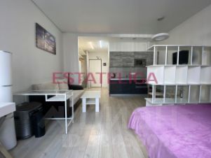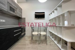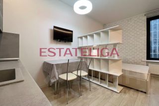 Функциональное и уютное зонирование апартамента: спальная зона с двуспальной кроватью, которая разделена книжной полкой от кухни с обеденной зоной, зона отдыха с раскладным диваном, рабочая зона с письменным столом, санузел с душевой кабиной, холл с просторной нишей для хранения вещей.