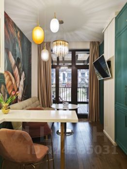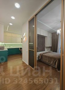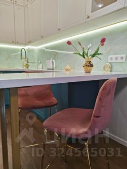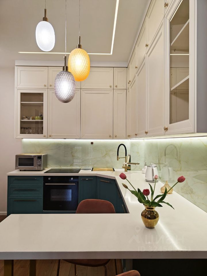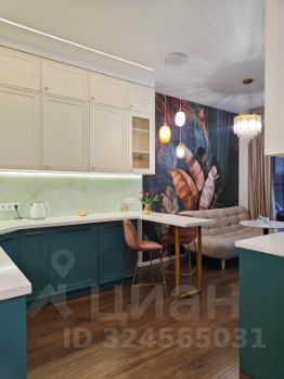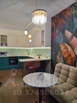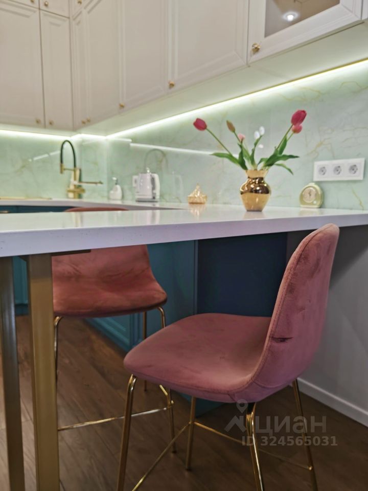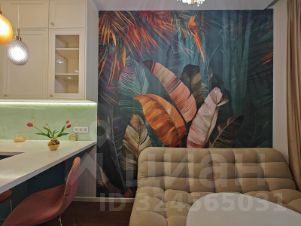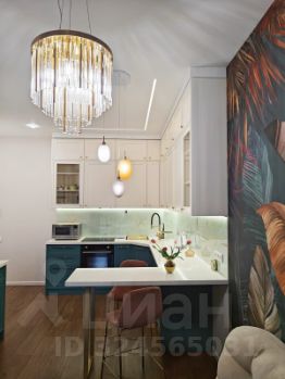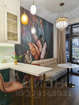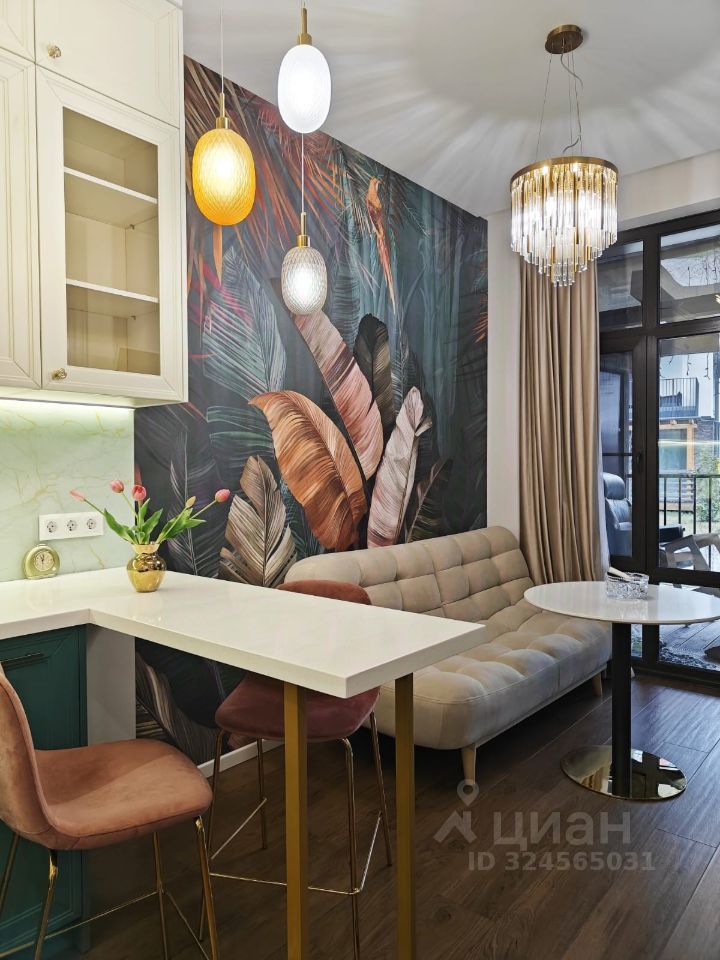 • Кухня гостиная открытой планировки (16м2) — уютная, с яркими акцентами. В центре композиции — барная стойка с золотистой опорой и барными стульями в бархатной обивке. Акцентная стена оформлена выразительным растительным фотопанно с крупными листьями, рядом комфортный бежевый диван. Освещение продумано многослойно: три подвесных светильника разной формы и элегантная хрустальная люстра создают интимную, праздничную атмосферу. Деревянный пол придаёт интерьеру теплоту. Пространство функциональное и очень фотогеничное.