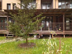 Самый популярный тип квартир, со своей большой уютной деревянной террасой (20м2) с видом на зеленый внутренний двор, идеальное место для утреннего кофе или вечернего отдыха, с видом на благоустроенный двор и современные дома в стиле шале. Тихо, зелено и по-домашнему привлекательно — прекрасное место для расслабления и маленьких радостей повседневной жизни.