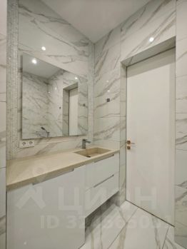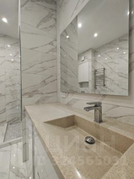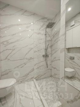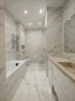 • Ванная комната (5,9м2)— светлая и современная в стиле минимализм. Стены и пол облицованы крупноформатной плиткой под мрамор — белый фон с мягкими серыми прожилками, что придаёт пространству элегантный вид. В ванной комнате есть и просторный душ и ванна.