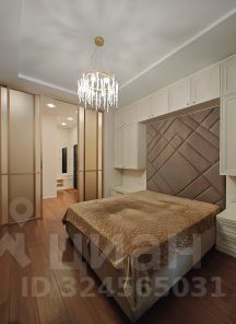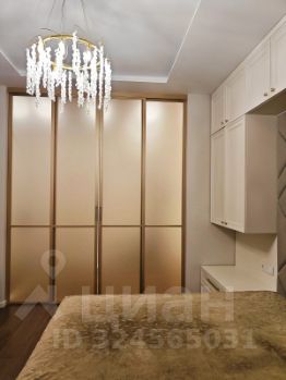 • Отдельная спальня (13,5м2) — в спокойной бежево коричневой гамме также с акцентными элементами. Большая мягкая кровать с высоким мягким изголовьем и подъемным механизмом. Освещение обеспечивают декоративная подвесная люстра с золотым каркасом и свисающими кристаллическими элементами, создающая мягкие тени на потолке. Раздвижные двери с латунной рамой разделяют пространство или объединяют его.