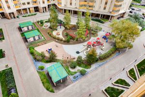 Роскошная территория комплекса с детскими площадками, спортивным ядром, на котором расположен малый теннис и корт для большого тенниса, баскетбольная, футбольная площадка, дорожки для бега и катания на роликах, велосипедах, зимой заливают каток, летом можно любоваться предметами ландшафтного дизайна. Этот вид приятно радует!