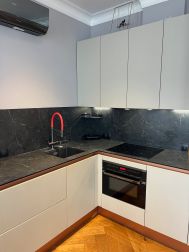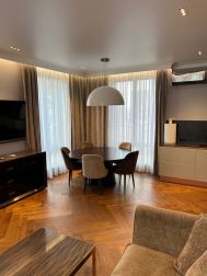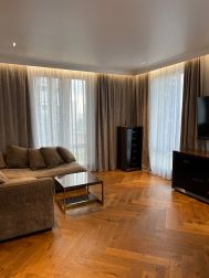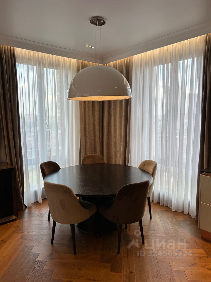 3-х комнатная квартира в ЖК премиум класса "Пресня Сити" в Восточной башне. Ремонту, мебели и технике 5 лет. Полы - паркет из дуба, стены окрашены эко краской, вся мебель из массива зебрано. Высота потолка 3.1 м. Два санузла, зал объединён с кухней, изолированные спальная (со своим санузлом) и детская, большая гардеробная.