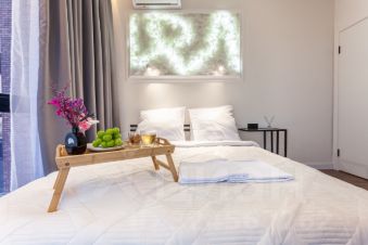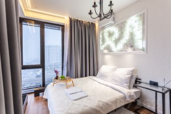 С потрясающими панорамными окнами на две стены. Вы сможете наслаждаться видом на Измайловский Кремль и город прямо из вашей двуспальной кровати с ортопедическим матрасом, создавая ощущение сна среди облаков.