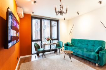 Обеденная зона может быть перемещена в любое удобное место, но как же приятно расположиться у окна, где можно наслаждаться видом во время работы или отдыха. Также в гостиной есть раскладной диван на 2 спальных места, журнальный столик и телевизор с Яндекс Алисой, которая поможет вам выбрать фильм или настроить музыку под настроение.