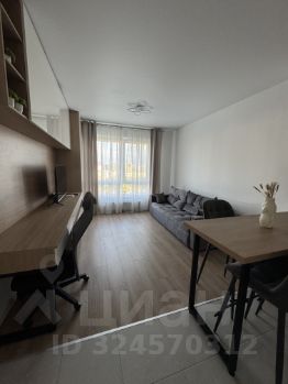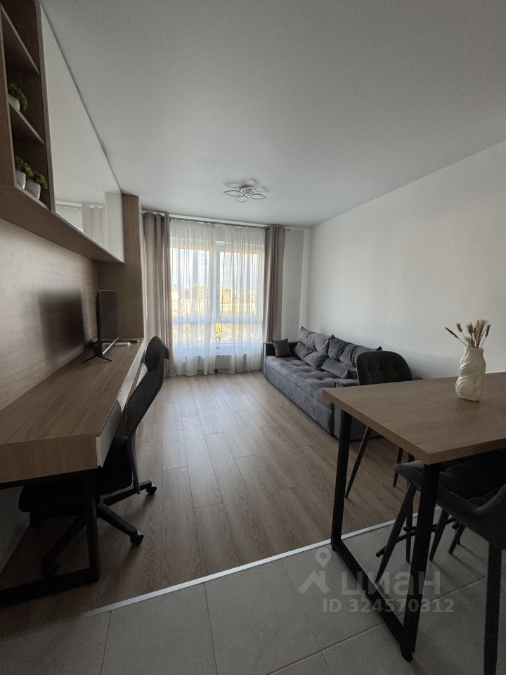 Стильная квартира с функциональной планировкой: просторная кухня-гостиная с мягким диваном, телевизором и уютной зоной домашнего офиса, в спальне кровать с ортопедическим матрасом и подъёмным механизмом, вместительный шкаф, санузел и зона прихожей.