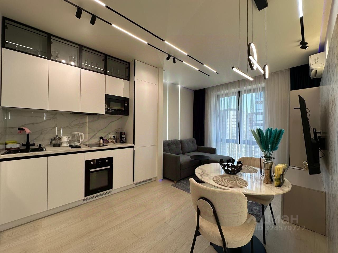 Техника: встроенный холодильник, посудомоечная машина, варочная поверхность, духовой шкаф, вытяжка, стиральная машина, 2 кондиционера, 2 телевизора.