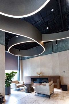 В ЖК расположено гранд-лобби проекта со стойкой ресепшн. В корпусе есть лаунж-зона с камином.