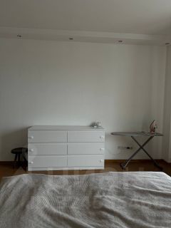 Большая спальня - кровать квин-сайз, с кожаным изголовьем. Широкий и длинный шкаф- купе, комод, тумба.