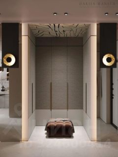 В гардеробной — дизайнерские фасады с текстурой льна и акцентный потолок, который создаёт атмосферу элитного салона.