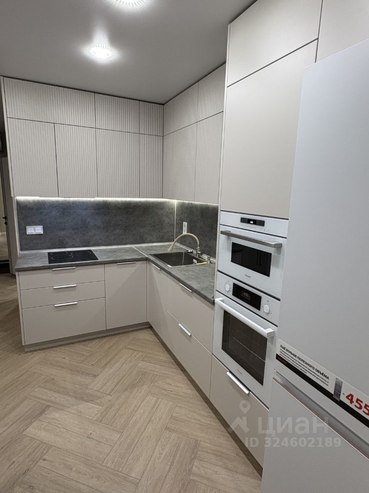 Просторная кухня со всей необходимой встроенной техникой: плита, духовой шкаф, вытяжка, посудомоечная машинка, холодильник.