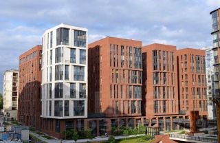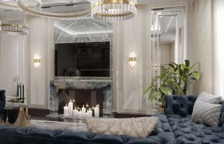 ЖК "Садовые кварталы" выполнен в стиле ар-деко. Стиль ар-деко протекает из входной парадной зоны, выполненной в экстравагантных шоколадных оттенках с огромной шикарной люстрой, в просторную гостиную, где нам открывается вид на респектабельную диванную группу в глубоких синих цветах, которая окружает камин с отделкой из мрамора. На полу дубовый паркет со вставками глянцевого керамогранита, стены и потолок оформлены лепниной.