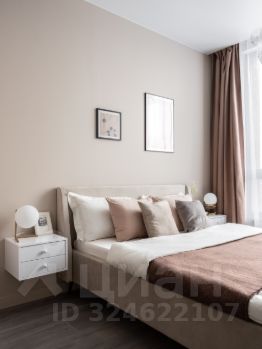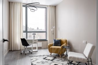В мастер-спальне удобная кровать с ортопедическим матрасом, вместительный дизайнерский шкаф-купе, который не заметен в пространстве благодаря своему цвету, который повторяет цвет стен. Плотные шторы, позволят расслабиться и отдохнуть в любое время суток. Также в спальне есть смарт телевизор 55 дюймов. Несомненным плюсом является то, в отдельную ванную комнату с теплыми полами можно зайти только из спальни.