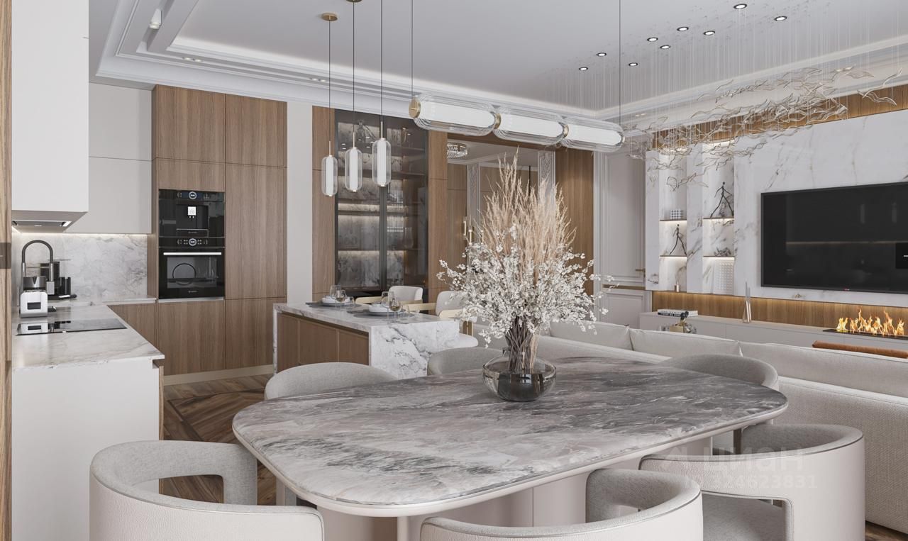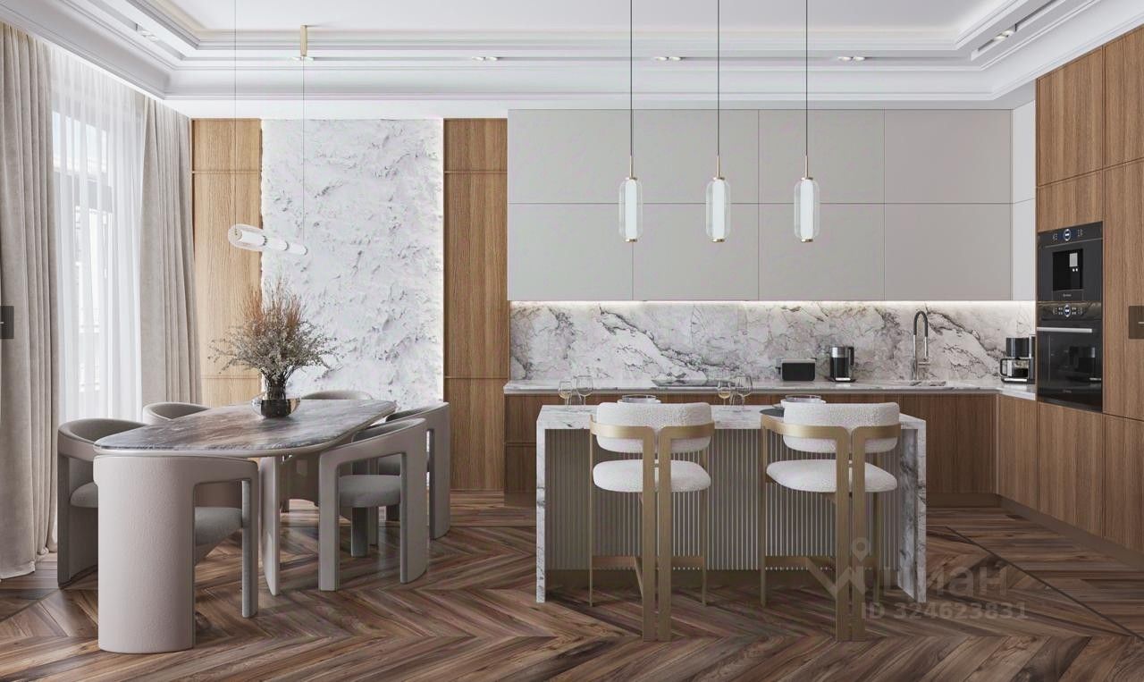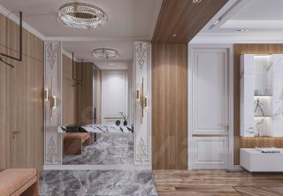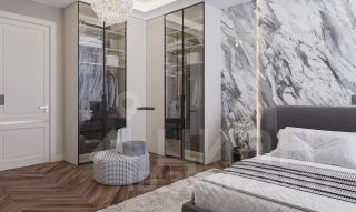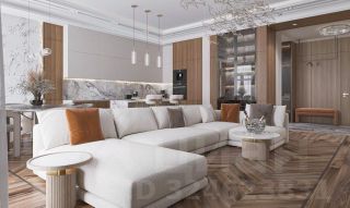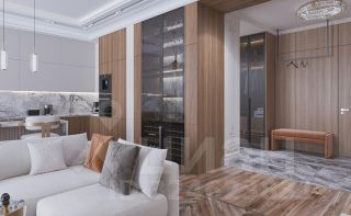 Яркий дизайн-проект квартиры в современном стиле в ЖК Лаки с элементами неоклассики. Кухонное пространство объединено с гостиной. Просторная итальянская кухня в современном стиле в отделках шпона и эмали дополнена островом. Спальня выполнена в светлых оттенках. Основная стена за изголовьем кровати выложена крупноформатным керамогранитом и дополнена вертикальной подсветкой. Стильная атмосфера царит в ванной комнате, оформленной в цвете "темный графит". Второй санузел, гостевой оформлен керамогранитом под оникс, также там размещена постирочная.