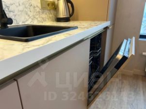 Просторная кухня-гостиная оборудована современной встроенной техникой, включая посудомоечную машину, кондиционер.