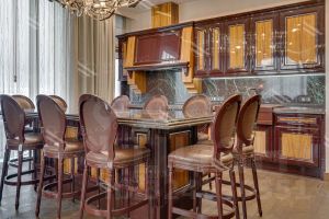 Итальянские барные стулья от фабрики Bakokko и премиальная немецкая встроенная техника Kueppersbusch обеспечивают не только эстетическое удовольствие, но и максимальную функциональность.